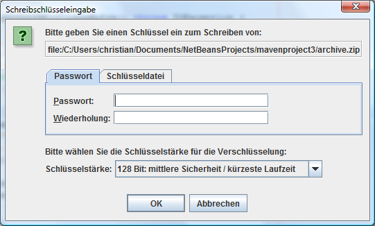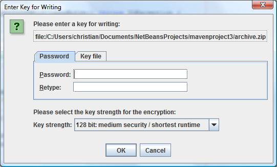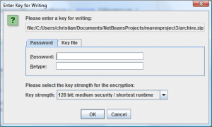 When you run these examples, you should see a Swing dialog prompting you for a password for the archive files archive.tzp or archive.zip respectively. This is how it looks in English: